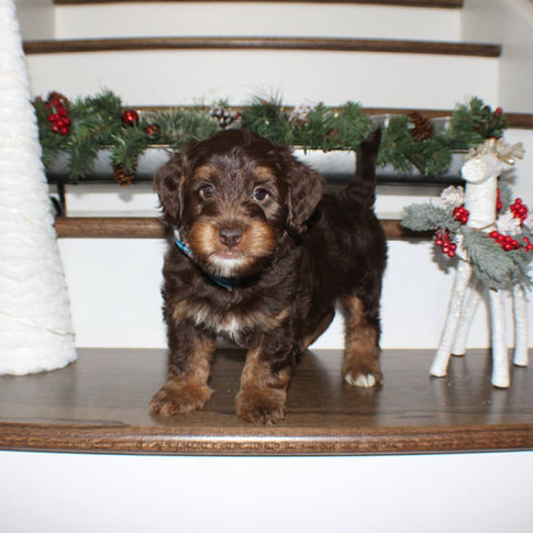 Reese is a Chocolate/Tan Phantom Mini with a wavy fleece coat. She has an exceptional demeanor, is very athletic, yet calm, well mannered and devoted to our family. She is a wonderful mother. She even "mothers" our (human) children. She is adored by all and such a blessing to our family! She has such beautiful puppies.